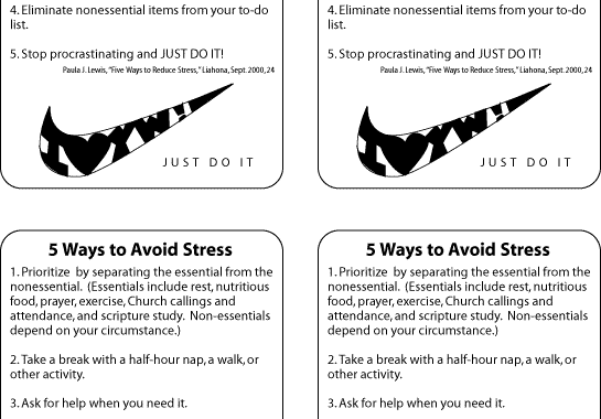 Paula J. Lewis, “Five Ways to Reduce Stress,” Liahona, Sept. 2000, 24 1. Prioritize by separating the essential from the nonessential. (Essentials include rest, nutritious food, prayer, exercise, Church callings and attendance, and scripture study. Non-essentials ... Retrieve Doc